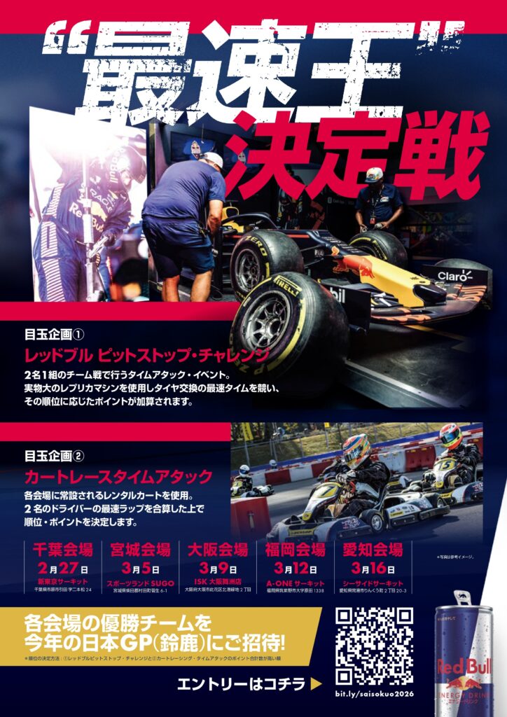 実物大のレプリカマシンを使用し、2名1組のチームでタイヤ交換の最速記録を目指す、参加型イベント。そう! サーキットで大勢のクルーが秒で完了させるあれッ!その興奮や緊張感が誰でも体感できちゃうというもの。